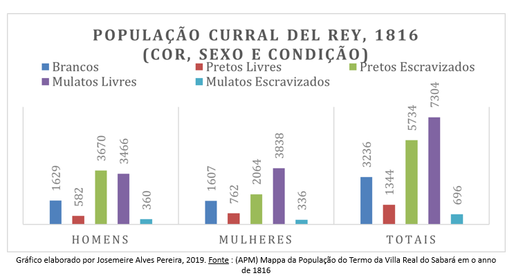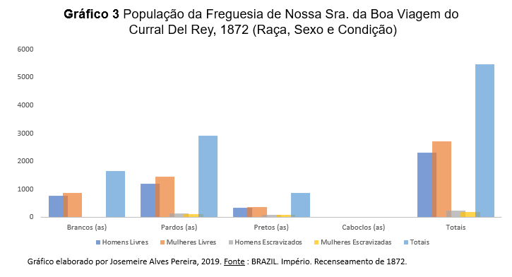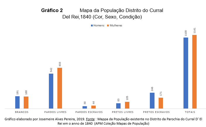 A presença de gente africana e sua descendência produzindo o território foi registrada nos Mapas de População, desde os tempos da então freguesia do Curral Del Rei. No século XIX, a soma da população descrita como “preta” e “parda” (ou “mulata”), independente do aumento ou queda da população total, chegou a perfazer cerca de 70% a 80% (PEREIRA, 2019, p. 34-90). No Recenseamento do Império do Brazil, de 1872, das 5.463 pessoas que compunham, então, a população da freguesia de N. Sra. da Boa Viagem do Curral del Rei, 5.027 eram livres e 436 escravizadas. Dentre as livres, observa-se uma maioria de gente preta e parda: 1449 mulheres pardas, 1212 homens pardos, 376 mulheres pretas e 336 homens pretos, notando-se a predominância dos considerados pardos – especialmente das mulheres pardas. Já dentre as/os escravizadas/os, os 155 homens pardos predominavam, sendo seguidos pelas 111 mulheres pardas, 86 homens pretos e 84 mulheres pretas.