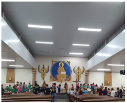 Na parede está o sacrário com uma lâmpada acesa, significando a presença real de Jesus na eucaristia, segundo a fé católica.
