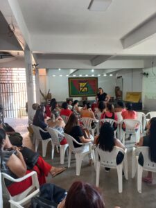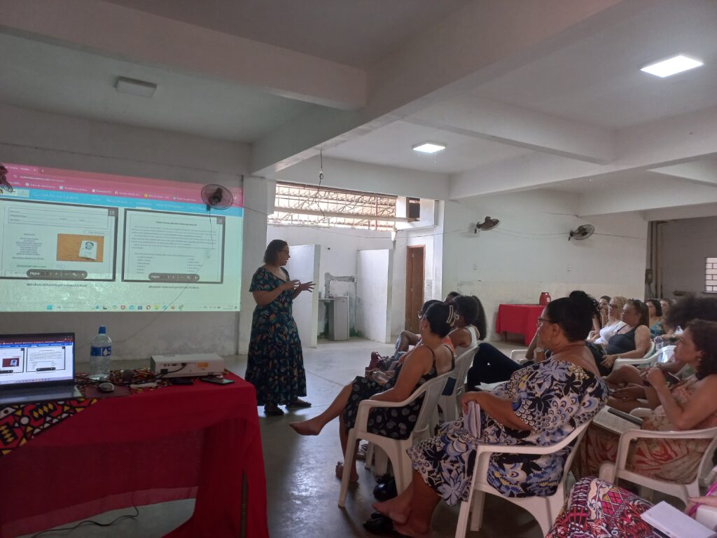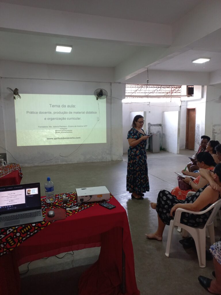 A formação teve como tema central “Educação Escolar Quilombola: construindo práticas antirracistas e emancipatórias”, e foi ministrada pela Professora Juliana Pacheco de Oliveira, Mestra em Ensino de História (UFF), que atua como dinamizadora do Programa de Ensino de Cultura e História Africanas, Afro-Brasileira e Indígena na rede municipal de ensino de Cabo Frio e coordenadora de educação escolar quilombola e antirracista da Prefeitura Municipal de São Pedro da Aldeia, estado do Rio de Janeiro.