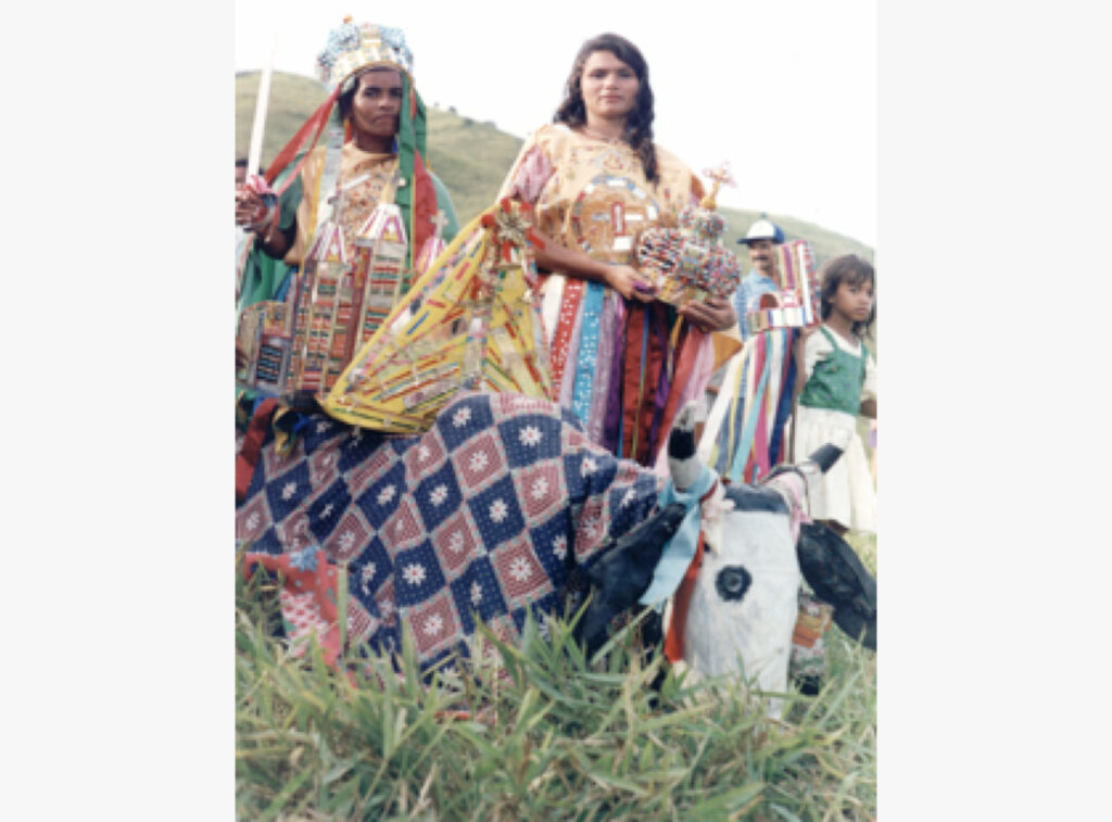 Descrição: Grupo de Guerreiro, com duas rainhas de Guerreiro e o boi do Guerreiro no Quilombo dos Palmares, 2001.