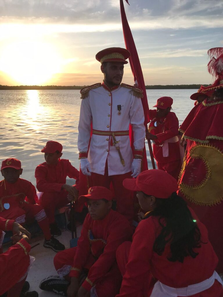 Descrição: Foto dos Mouros do grupo de Luta entre Mouros e Cristãos de Caravelas num barco durante a chegada do grupo em Caravelas, Bahia, em janeiro 2024