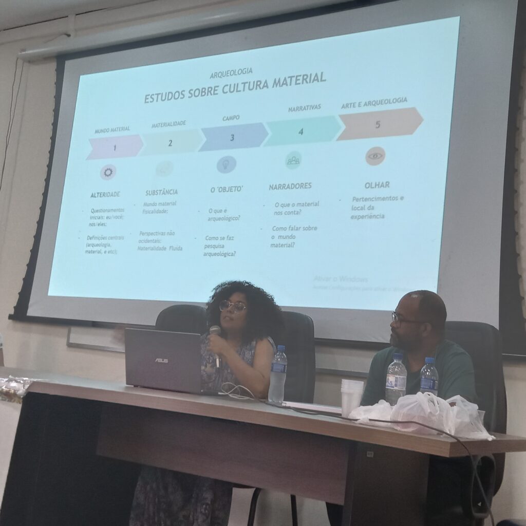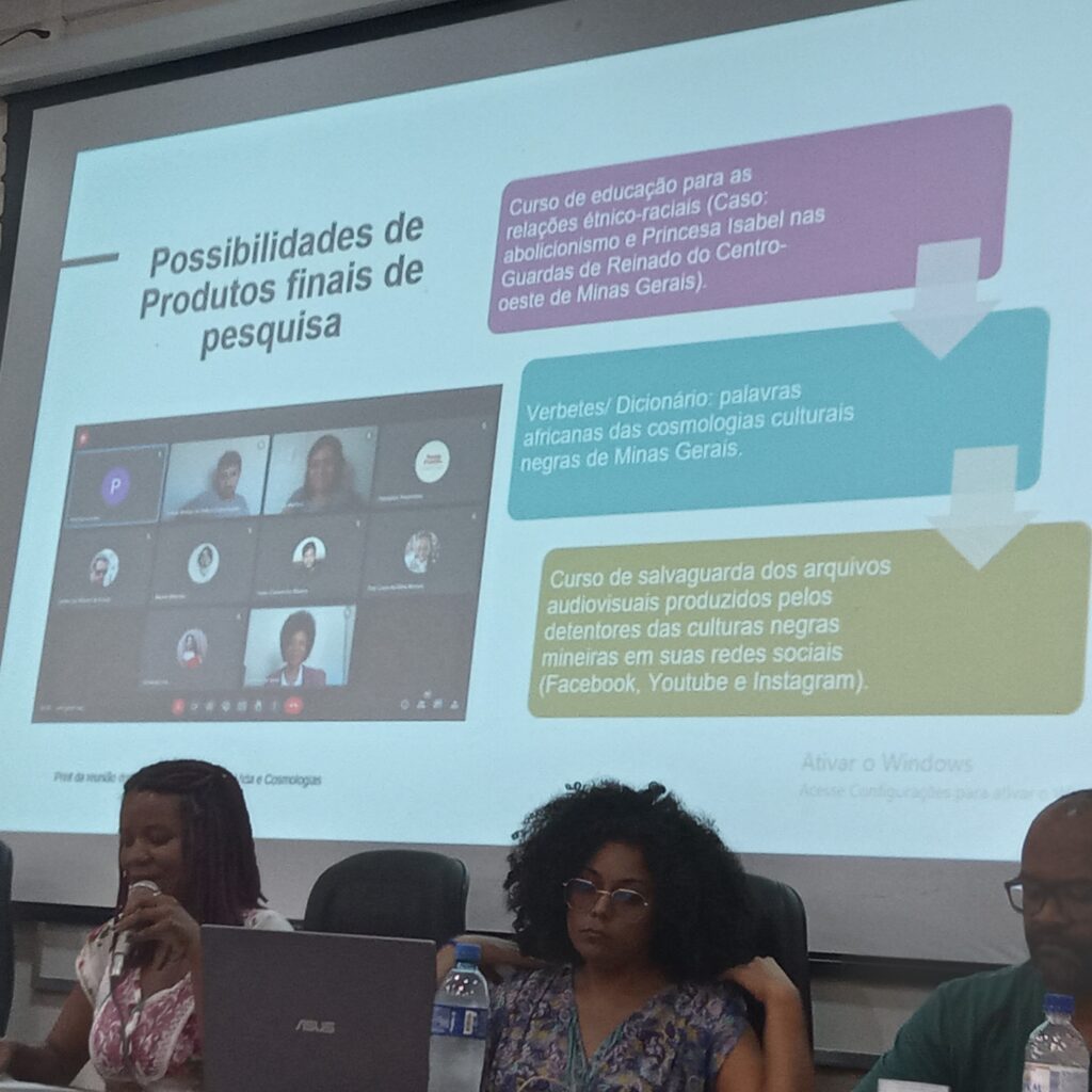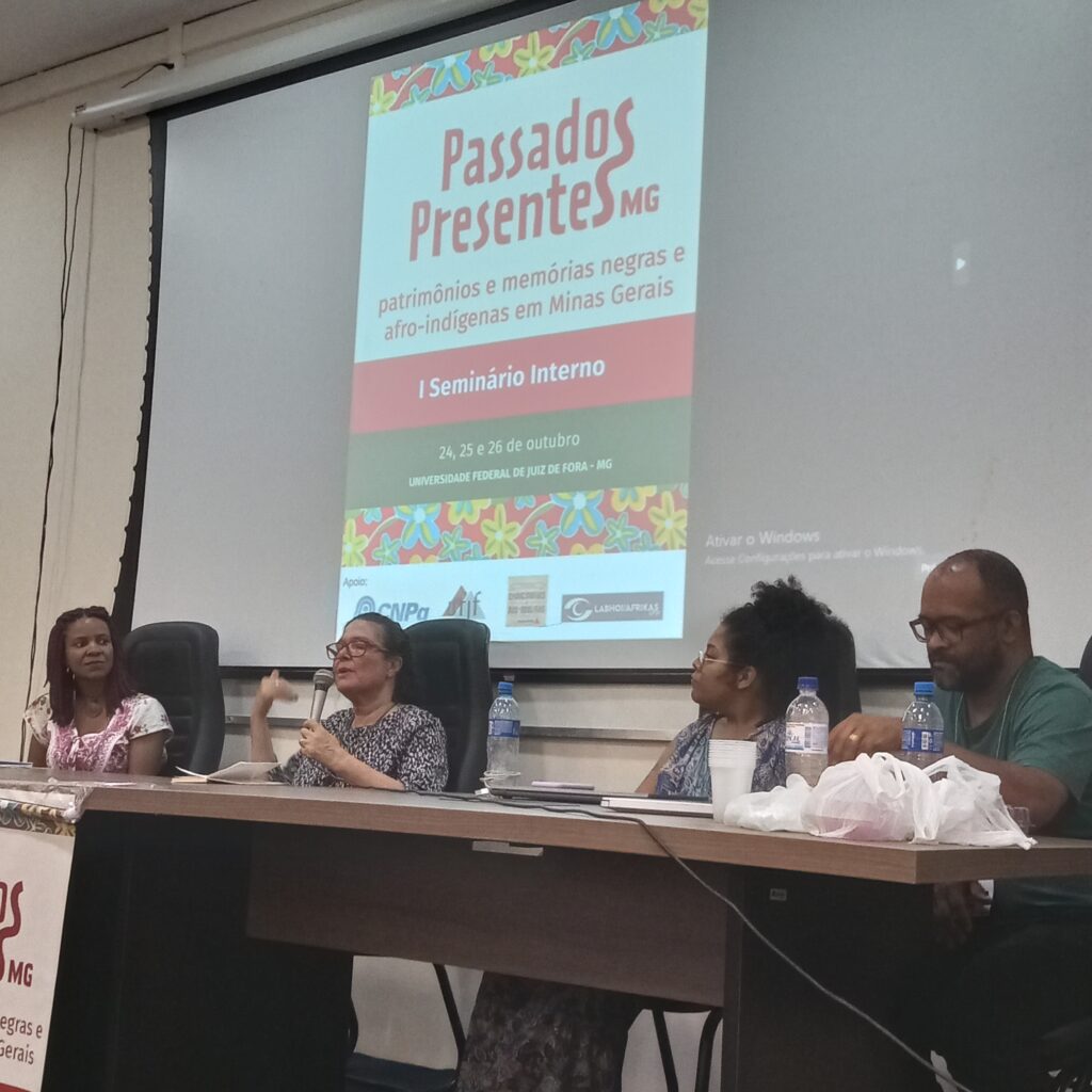 Apresentação dos grupos de trabalho do projeto Passados Presentes: Patrimônios e memórias negras e afroindígenas em Minas Gerais, compondo a mesa os representantes e mediadores dos grupos, Profa. Me. Simone de Assis, a arqueóloga Joyce Santos e o Prof. Dr. Luciano Roza. Foto: Tayane Oliveira, UFJF, 2023. A Profa. Me. Simone de Assis apresenta o grupo de trabalho “Festas, Modos de vida e Cosmologias” do projeto Passados Presentes: Ptrimônios e memórias negras e afroindígenas em Minas Gerais, compondo a mesa estam a a arqueóloga Joyce Santos e o Prof. Dr. Luciano Roza. Foto: Tayane Oliveira, UFJF, 2023.Apresentação do grupo de trabalho “Cultura Material” realizado pela arqueóloga Joyce Santos, compondo a mesa está o Prof. Dr. Luciano Roza. Foto: Tayane Oliveira, UFJF, 2023.Apresentação do grupo de trabalho “Cidades Negras, Territorialidades e Georeferrenciamento” realizado pela Profa. Dra. Hebe Mattos, compondo a mesa estam a Profa. Me. Simone de Assis, a arqueóloga Joyce Santos e o Prof. Dr. Luciano Roza. Foto: Tayane Oliveira, UFJF, 2023.